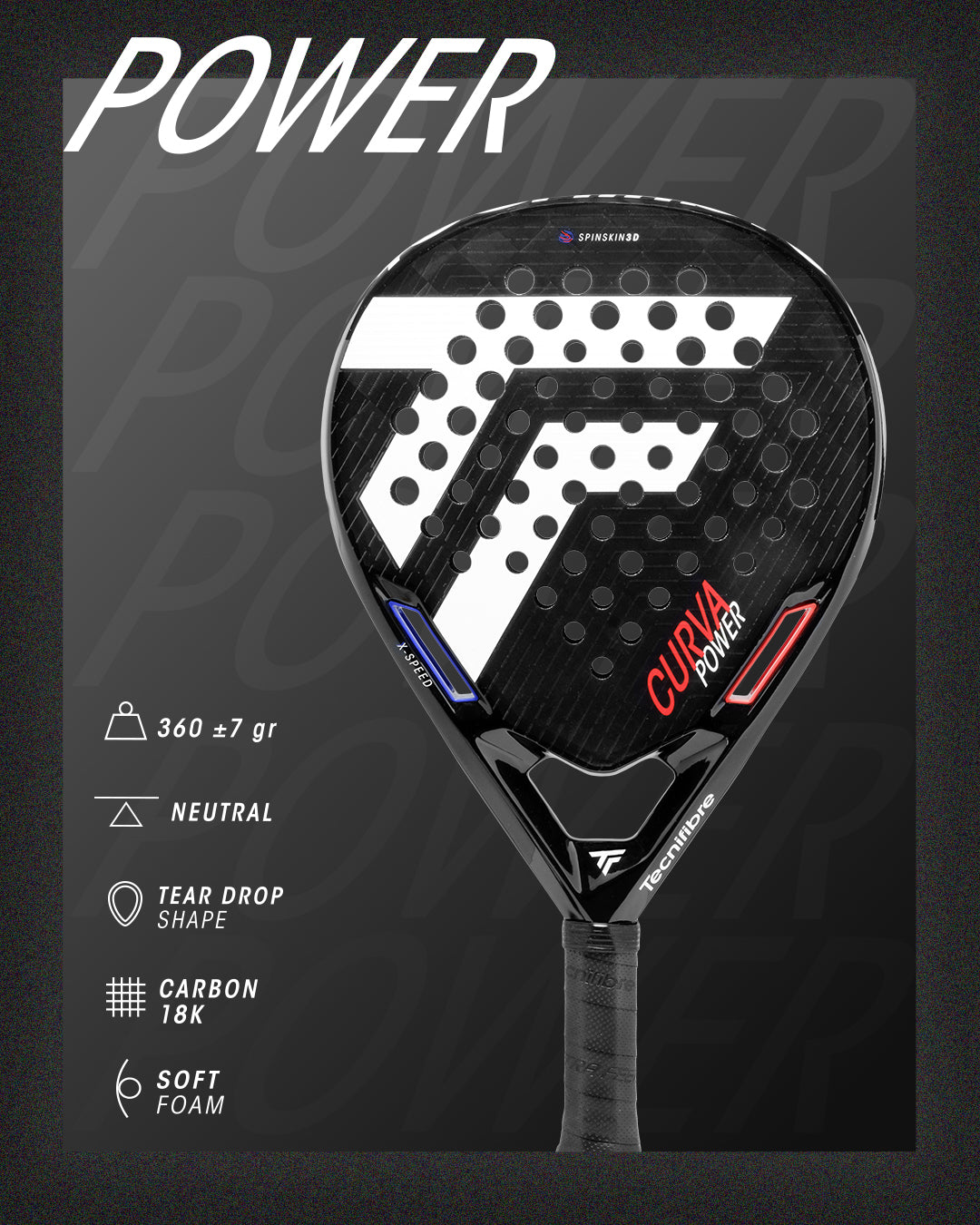 The CURVA POWER TECNIFIBRE Adult Padel Racket features a versatile teardrop shape, combined with open-weave 18k carbon to maximize power, and single-piece, soft foam for added elasticity and comfort. 360 g weight and neutral balance for optimum maneuverability and speed.