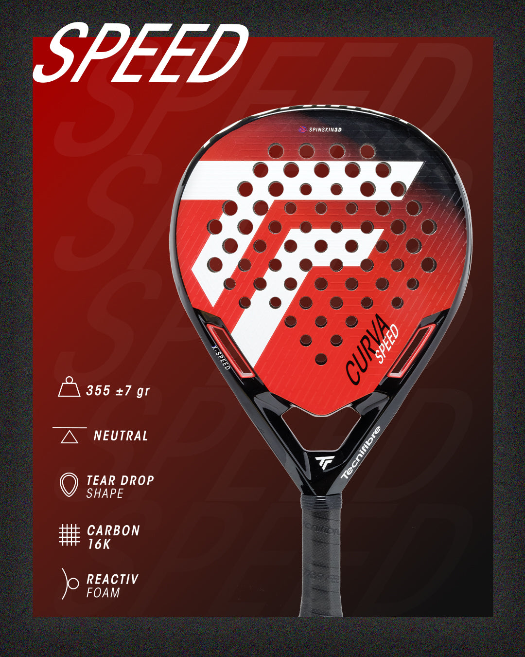 he CURVA SPEED TECNIFIBRE Adult Padel Racket has a versatile teardrop shape, combined with 16k carbon for greater responsiveness, and firm sandwich foam for greater control and mastery of shots. Weighing in at just 355 g, this is the lightest in the range.